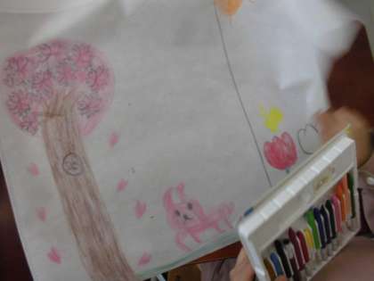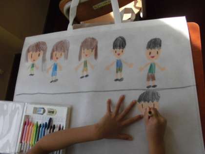 作品バッグに絵を描きました。思い出の絵を描いている子や友達の絵を描いている子,自分の好きなもの,季節の絵など,すてきな作品バッグになりました。今まで作ってきたものをバッグに詰めて持って帰りました。お家でも,お子さんの頑張りを褒めていただけたら,と思います。