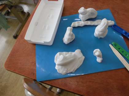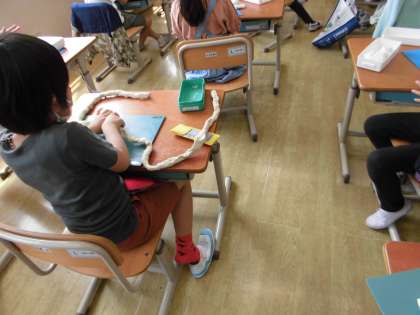 図工科の学習で,粘土をにぎって楽しみました。指の跡がついてボコボコした形になり,「カバみたい!」「鳥に見えるよ!」と目が輝きます。そこにいろいろ付け加えて仕上げました。最後はみんなで,いろいろな発想でできた作品を楽しく鑑賞しました。