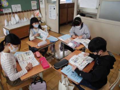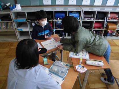 外国語では習った表現に親しむために,近くの友だちと表現を使ったゲームをしています。繰り返し使うことで,身に付けていきましょう。