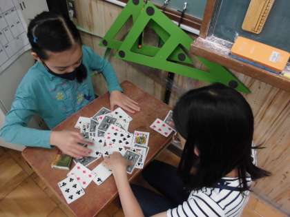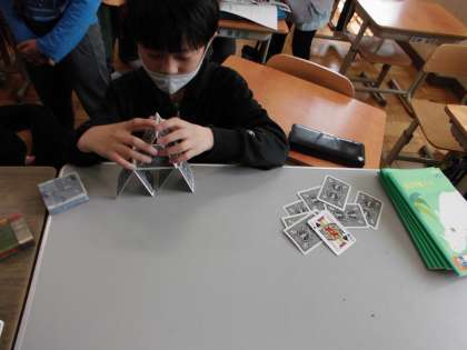 チャレンジ係からの提案で,トランプタワーに挑戦しました。