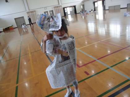 新聞紙を広くひろげて島を作ったり,体育館に置いてある階段を使って秘密基地を作ったり,身にまとう洋服を作ったり…
