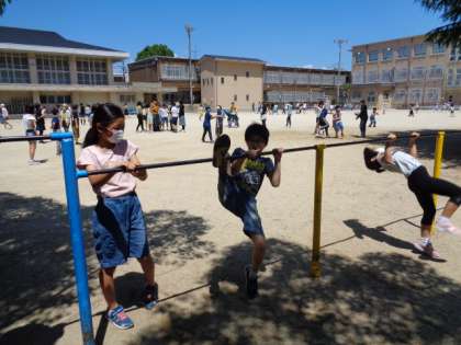 いつもおにごっこやボールで遊んでいる子たちが鉄棒に・・。