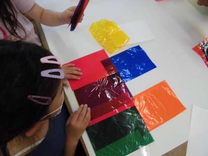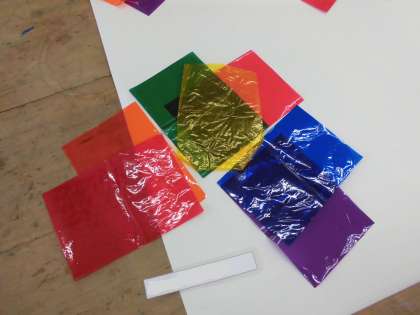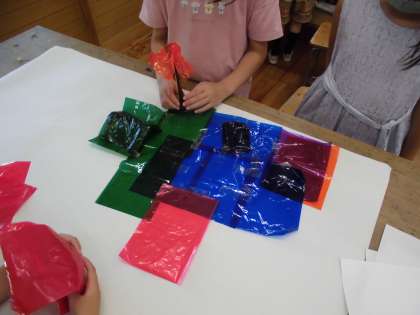 カラーセロファンをならべ,重なりから,どんな色になるか,どんな形ができるかという鑑賞の授業をしました。