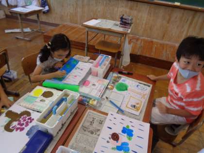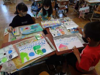 絵の具で表した後,ペンで仕上げをして,友達にどんな絵に見えるかをアドバイスしてもらいました。みんな満足のいく一枚を仕上げることができました。
