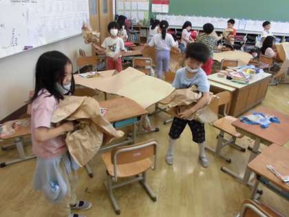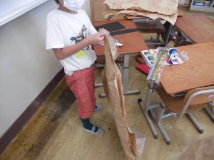 クラフト紙を使って,紙をくしゃくしゃにし,袋状にした中に新聞紙を詰めて,自分だけの作品を作りました!