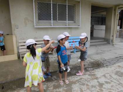 暑い日が続きますが,暑いからこそ楽しい遊びもあります。今日は、水を使って思いっきり遊びました。友達と追いかけっこをして水をかけあったり,どちらが遠くまで飛ばせるか競争したりして楽しんでいました。