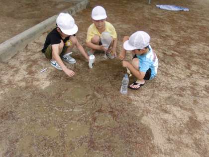 運動場という大きなキャンバスに水で絵を描いたり、友達と協力して水を何度も汲んで川を作ったりしている子もいました。
