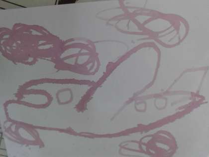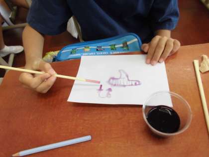 冷凍して保存していただいていた朝顔の花で、色水あそびをしました。「うわー!水がこんなに濃い色になったよ。」「割りばしにつけると、絵が描けるなんて面白いな。」「朝顔の汁で朝顔を描いてみた。」と、とても楽しそうに色水あそびを楽しんでいました。