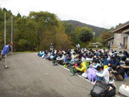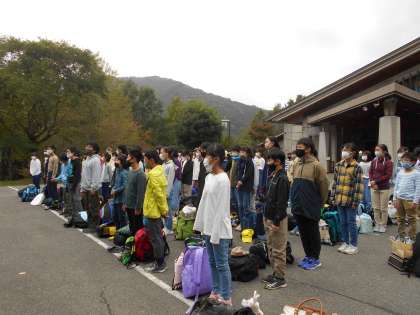 山の家に到着してすぐ,本館前広場で入所式を行いました。