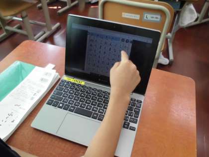 「たのしいな ことばあそび」では、タブレットに映された問題をよく見て、見つけた言葉に〇をしていきました。「あ!こんな言葉も隠れていたよ。」「ぼくは10個見つけたよ。みんなは何個見つけた?」と楽しそうに言葉見つけをしていました。次回は、問題作りにも挑戦します。
