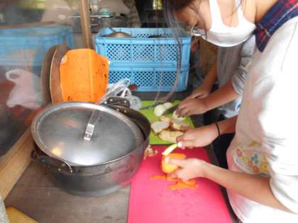 まずは,野菜を水洗いし,皮をむき,食べやすい大きさに包丁で切ります。