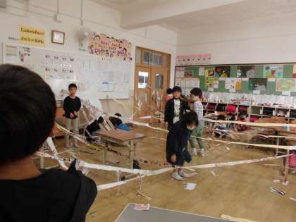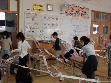 子どもたちはこういう活動が大好きで、どんどん紙をつないでいき、楽しそうに取り組んでいました。