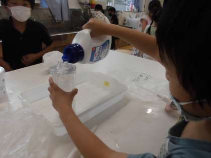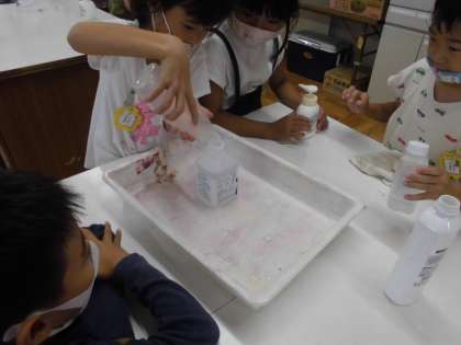 お家から持ってきた容器や水筒のかさを比べました。「見た目では、こっちのほうがいっぱい入りそうだったけど、水を入れてみたら、予想とちがっていたよ。」「コップを使うと、何杯分で比べられるから便利だね。」などと、かさくらべをしながらいい気づきをしていました。