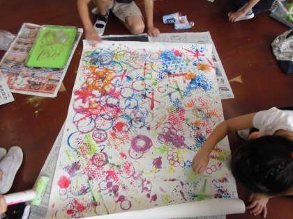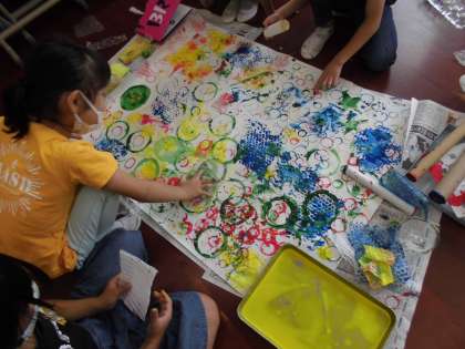「ぺったんコロコロ」では、お家から持ってきた材料に絵の具をつけて、大きな模造紙にスタンプをして楽しみました。出来上がった模様を見せ合い、「これ、面白い形だね。どうやって作ったの?」「色んな向きに変えながらスタンプしたんだよ。」と、面白い形を見つけ合っていました。