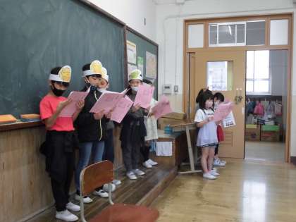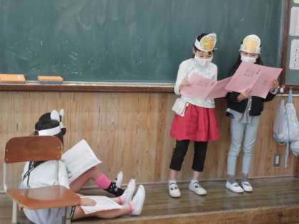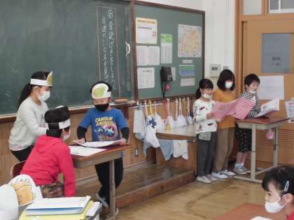 がまくんとかえるくんシリーズの中で、「おはなし」と「あとでやるよ」のどちらかのお話を選んで劇にしました。