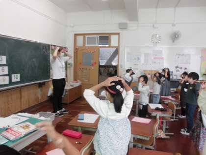 英語活動では、ゲームをしながら、あいさつの仕方や色や数の言い方に慣れ親しんでいます。ALTのナタリー先生が来られて、カラータッチゲームや友達集まれゲームを一緒にしました。ナタリー先生に色々な質問をして仲良くなっていました。