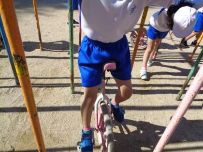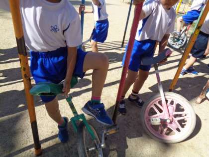一輪車に乗ってみましたが、バランスをとるのがとても難しいようでした。