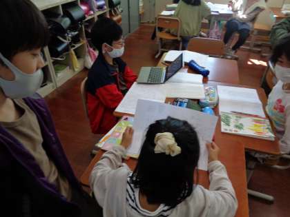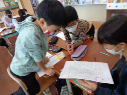 この写真は,リーフレットの下書きを見て,子ども同士でアドバイスをしている写真です。