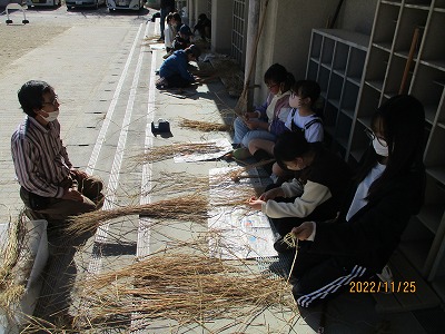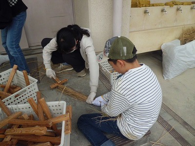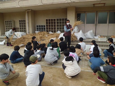 先日,掃除した「わら」を,木槌で何度も叩いて,柔らかくしました。そうすることで,より綯(な)いやすくなりました。これを使って,今週の金曜日,いよいよ「わら細工」を行います。