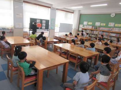 初めて、学校の図書館に入って、図書館の使い方や大切なことなどの話を聞きました。
