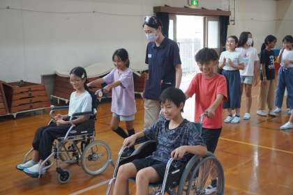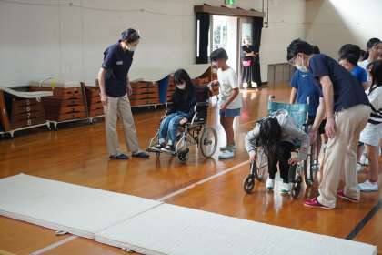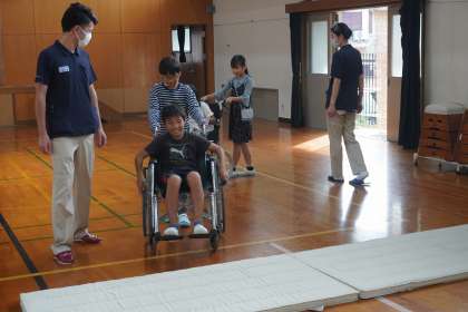 子どもたちは「車いす体験」「高齢者疑似体験」「とろみ体験」の3つを体験しました。