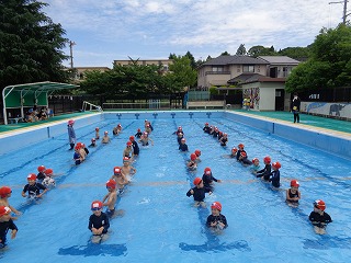 昨日から、プールでの学習が始まりました。今週は、低い水位で水に慣れる学習をしました。プールに入るときの約束を確かめたり、ワニ歩きやじゃんけん列車をして楽しんだりしました。来週からは水位が上がり、顔をつけたり浮いたりする学習に入っていく予定です。