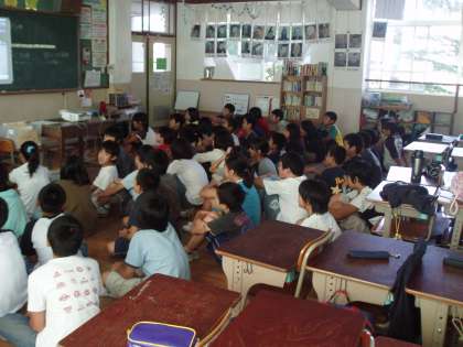 VTRを見て,自分達の姿に驚く6年生の子ども達。