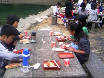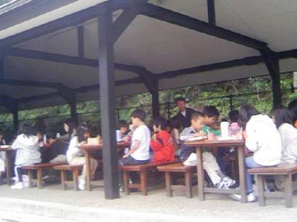 昨日のキャンプファイヤーで盛り上がったため少々お疲れ気味のよう。朝のつどいを終え、朝食中です。