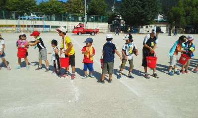 次は、消防分団と左京消防署の方々にお世話になり、消火器によるまと当てや自転車発電体験・119番通報体験・バケツリレー等をしました。