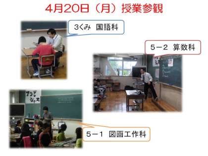 4月20日(月)は,5年・6年・3くみの授業参観・懇談会がありました。画像は,授業の一部です。雨天でしたが,数多くのご参観,ありがとうございました。