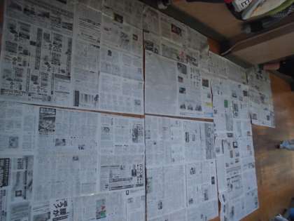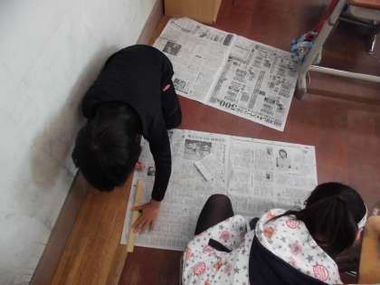 算数科で「面積」の学習をしたときの様子です。1平方メートルを実際に自分たちで作る学習をしました。新聞紙を使って協力して作りました。みんなが作った1平方メートルの新聞紙をろうかにならべて,その広さを調べました。広さについての理解を深めることができました。