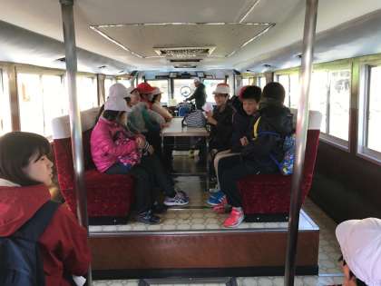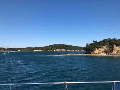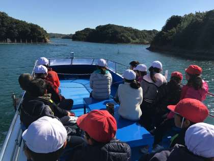 賢島港から乗船して,いかだや周りの島のことなどの説明を聞きながら,なかよし港に向かいます。風を感じながらすすんでいきます。