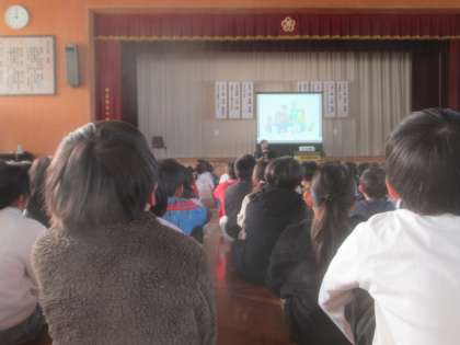 校長先生の読み聞かせでは、「心のバケツ」についての話を真剣に聞いていました。