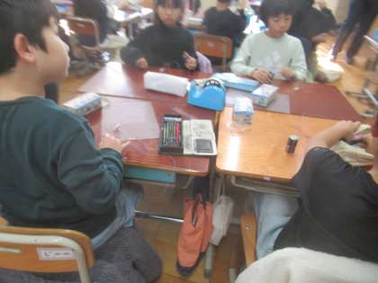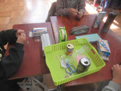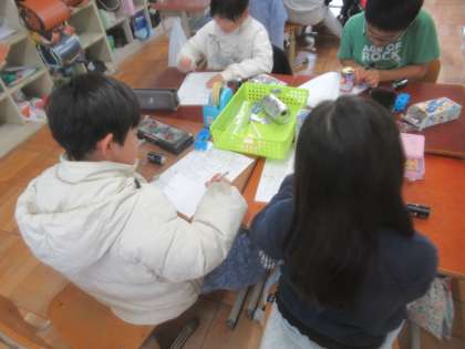豆電球と電池を導線でつなぎ、その間に缶やおはじき、びんなど様々なものをつないで、電気が通るかを調べていきました。