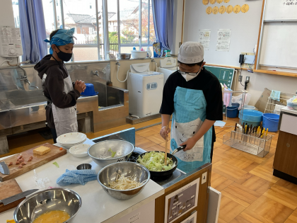 家庭科の学習では、グループごとに選んだ献立の調理実習を行っています。1学期に行った調理自習の反省を生かしながら、手際よく調理するためにはどうすればよいか工夫しながら活動する様子が見られました。