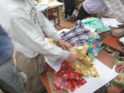 布の触った感じや柄を見て、紙に置いてみながらどんな作品にするかを考えていました。
