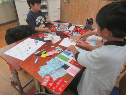 集めてもらった布を切ったり、重ねたりして紙に貼り、作品を作りました。