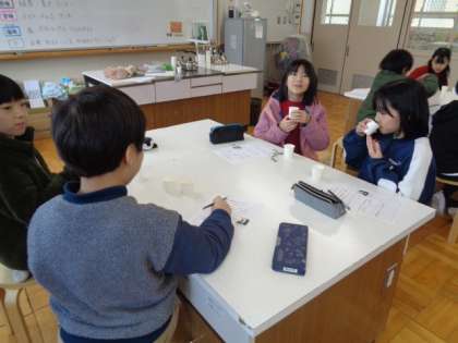 授業の中では、だし入りのものと、だしの入っていないもの(お湯)を飲み比べました。