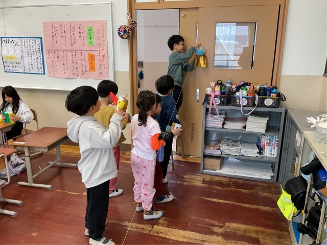 お試しコーナーに糸を張って、みんなで試しながら、楽しんで作っていました。