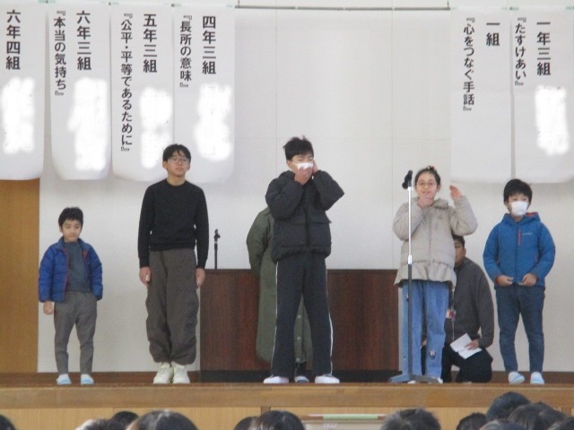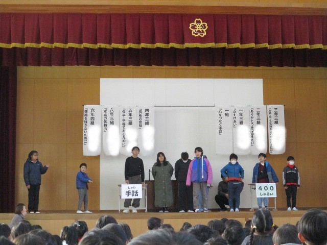 人権集会で、1組は「心をつなぐ手話」について発表しました。これまで音楽科や道徳科、学活等で手話や耳の聞こえない人達について学習してきました。学んできたことから、それぞれが感じたこと、考えたことを言葉や手話で伝えました。「手話でもっともっと人とのつながりが増えていくと思います。」「手話をもっと勉強して、耳の聞こえない人とも仲良くなりたいと思います。」1組の子ども達の思いが全校に広がり、たくさんの人がいろいろな立場の人についてもっと考えるきっかけになるといいなと思います。