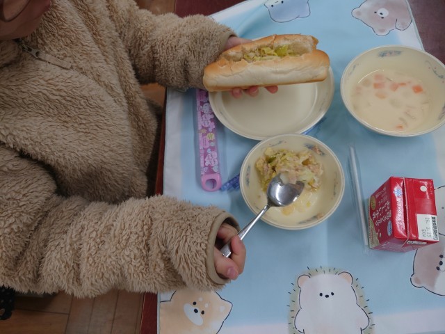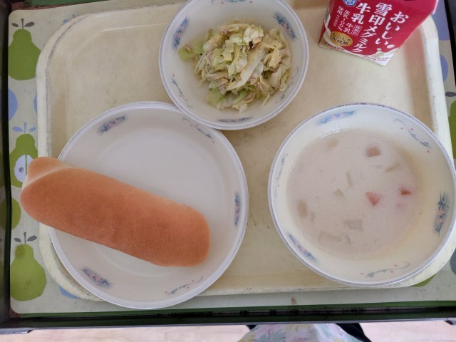 給食のカレーやシチューなどはルーから手作りしています。今日の「白いんげん豆のチャウダー」もルーから手作りしました。