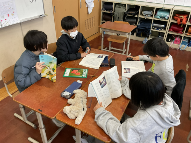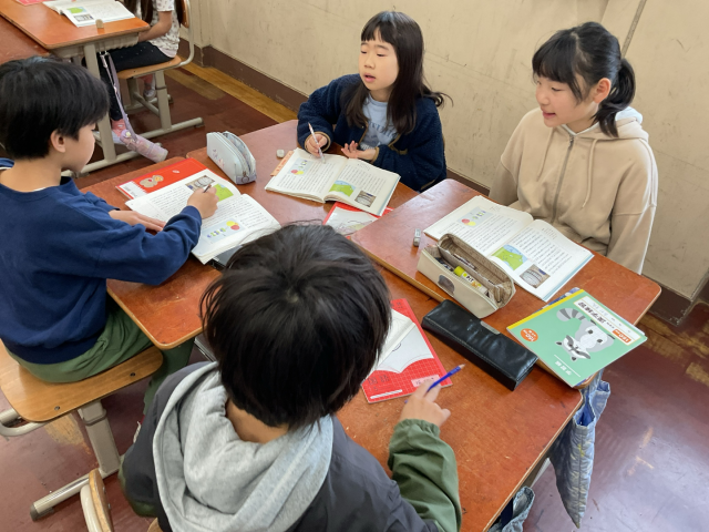 グループで段落の大切なことばを見つけて交流しています。