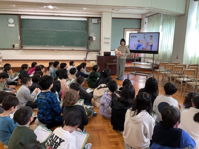 助産師さんに来ていただき、心と体の変化についてお話を聞きました。思春期に入ると、体つきや感じ方に少しずつ変化があらわれてくることや、その変化は人によって時期もスピードも違うことを、ていねいに教えていただきました。