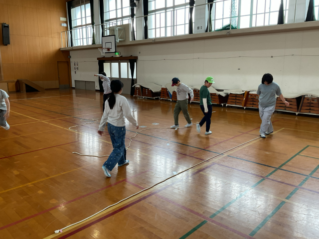片足で跳ぶ練習や、バランスボールの上に乗る活動、床に置いたロープに沿って落ちずに歩くなどの活動を楽しみました。