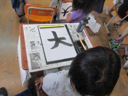 書写では今日,「大」を書きました。2画目と3画目のはらいの種類が違うことに気を付けながら書きました。