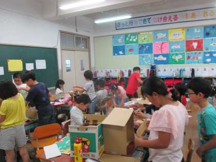 図工の学習で段ボールを使って箱づくりをしています。