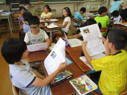 国語の時間に新聞の工夫を見つけて伝え合う学習を行いました。それぞれ読みやすくするための工夫を凝らして、新聞を作成しました。新聞を読みあって、班の人達の工夫を伝え合うことができました。