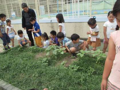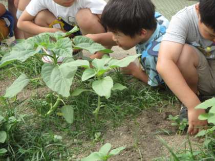 花壇にまいたひまわりの種が芽をだし,少し大きくなりました。「葉っぱはぎざぎざだね。」「さわるとざらざらだよ。」子どもたちは,五感で観察しています!