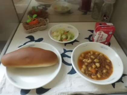 チリコンカーンは,大豆とひき肉と野菜を煮込んだアメリカの家庭料理です。カレー粉を加えて,スパイシーに仕上げています。カレー粉の風味を感じて子どもたちは,美味しくいただいていました。