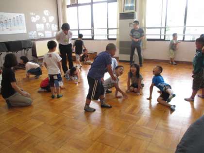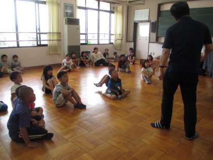 インプロを教えてもらっているすーさんと久しぶりの対面です。みんな、とても嬉しそうにしていました。インプロは即興劇なので,すーさんの言葉のマジックでどんなものにもすぐなれます。桃太郎のお話で「さあ、鬼が島を前にした、犬・雉・猿・桃太郎なんでもいいよ。なってごらん!」すぐになり切ってポーズ出来る2年生たちです。その後は,桃太郎のその後というお話をみんなで考えました。